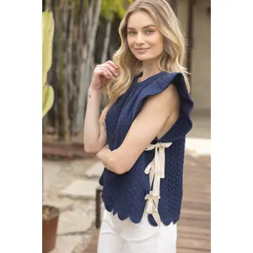 This Navy Twill Tape Tie Top brings a playful charm with its round neckline and flirty short ruffle sleeves. Delight in the delicate scallop embroidered hem and the sweet twill tape tie bows on the sides that add a touch of whimsy. Crafted from braid textured solid knit fabric, it offers both comfort and style. The back neck button closure ensures a perfect fit for your fun, casual looks.
